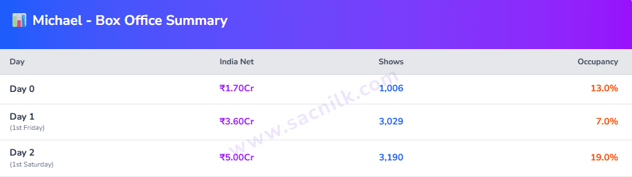 Sacnilk रिपोर्ट्स के अनुसार, ‘माइकल’ ने दूसरे दिन करीब 5 करोड़ रुपये का कलेक्शन किया. फिल्म को देशभर में लगभग 3000 से ज्यादा शोज मिले, जहां औसत ऑक्यूपेंसी करीब 19 प्रतिशत रही. हालांकि ये आंकड़े अभी शुरुआती हैं, लेकिन ट्रेंड साफ दिखा रहा है कि फिल्म धीरे-धीरे पकड़ बना रही है. दो दिन में फिल्म का कुल कलेक्शन करीब 10 करोड़ रुपये के पार पहुंच गया है.