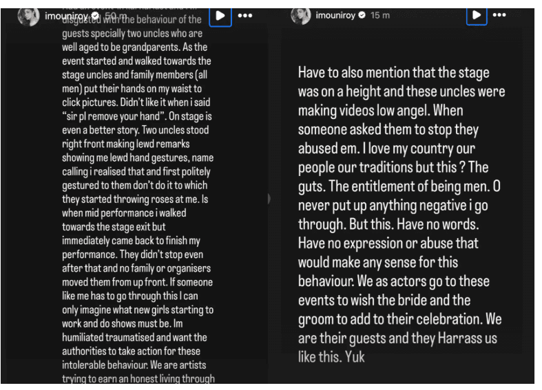 मौनी के अनुसार, स्थिति स्टेज पर और भी गंभीर हो गई. स्टेज के सामने खड़े दो पुरुषों ने अश्लील टिप्पणियां कीं और अपमानजनक हाव-भाव दिखाए. मौनी ने बताया कि उन्होंने धीरे-धीरे इनसे कहा कि ऐसा न करें, लेकिन इसके बावजूद उन्होंने उन्हें परेशान करना जारी रखा.