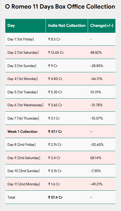 ट्रेड वेबसाइट Sacnilk की रिपोर्ट्स के मुताबिक, ‘ओ रोमियो’ ने 11वें दिन करीब 1.6 करोड़ रुपये का कारोबार किया है. वीकेंड के मुकाबले ये आंकड़ा काफी कम हैं. आमतौर पर सोमवार को फिल्मों की कमाई गिरती है, लेकिन इस बार गिरावट उम्मीद से ज्यादा रही. हालांकि, कुल मिलाकर फिल्म का नेट कलेक्शन अब तक करीब 60 करोड़ रुपये के आसपास पहुंच गया है. फिल्म अपने बजट को कवर करने की कोशिश में लगी है, लेकिन मौजूदा रफ्तार को देखते हुए राह आसान नहीं लग रही.