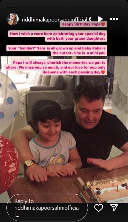 पोस्ट में क्या लिखा रिद्धिमा ने इंस्टाग्राम स्टोरी पर अपने पापा के साथ एक क्यूट की फोटो शेयर की, जिसके कैप्शन में लिखा, “हैप्पी बर्थडे पापा. काश आप यहां अपनी पोती और नातिन के साथ अपना खास दिन मनाते. आपकी “बंदरी” सैम बड़ी हो गई है और बेबी राहा सबसे प्यारी है. वह आपकी ही मिनी वर्जन है… पापा हम आपकी याद को हमेशा संजोकर रखेंगे, हम आपको बहुत याद करते हैं और आपके प्रति हमारा प्यार हर गुजरते दिन के साथ और गहरा होता जाता है.”