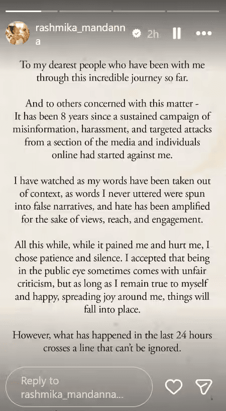 रश्मिका ने एक लंबा पोस्ट शेयर करते हुए लिखा कि जो लोग उनकी इस यात्रा में साथ रहे हैं और जो लोग इस मामले से जुड़े हैं, उन्हें सच पता होना चाहिए. उन्होंने कहा कि करीब 8 साल पहले कुछ मीडिया ग्रुप्स और ऑनलाइन यूजर्स ने उनके खिलाफ गलत जानकारी फैलाने और उन्हें टारगेट करने की कोशिश शुरू की थी. एक्ट्रेस ने यह भी कहा कि उनकी कई बातों को गलत तरीके से पेश किया गया और जो बातें उन्होंने कभी कही ही नहीं, उन्हें भी झूठी कहानियों में बदल दिया गया.