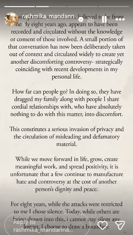 हालांकि, एक्ट्रेस ने कहा कि पिछले 24 घंटों में जो कुछ हुआ, उसने सारी हदें पार कर दी हैं. उनके मुताबिक यह पुरानी निजी बातचीत बिना अनुमति के रिकॉर्ड की गई थी और अब उसका एक छोटा हिस्सा गलत व्यू में वायरल किया जा रहा है. रश्मिका ने यह भी कहा कि इस विवाद में उनके परिवार को भी घसीटा जा रहा है, जबकि उनका इस मामले से कोई लेना-देना नहीं है. उन्होंने इसे अपनी प्राइवेसी पर हमला बताया. अंत में एक्ट्रेस ने साफ कहा कि जो लोग यह ऑडियो और उससे जुड़ी बातें फैला रहे हैं, वे इसे तुरंत हटा दें. उन्होंने 24 घंटे का समय देते हुए चेतावनी दी कि अगर ऐसा नहीं किया गया तो वह कानूनी कार्रवाई करेंगी.