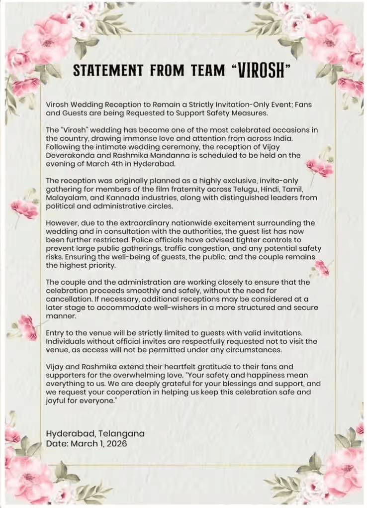 विजय और रश्मिका ने अपने चाहने वालों का शुक्रिया अदा करते हुए एक इमोशनल अपील भी की है. उन्होंने फैंस से अनुरोध किया है कि वे बिना निमंत्रण कार्ड के वेन्यू पर न पहुंचें और सुरक्षा व्यवस्था में सहयोग करें. कपल ने भरोसा दिलाया है कि वे जल्द ही अपनी खुशी फैंस के साथ साझा करने का खास तरीका जरूर ढूंढेंगे.