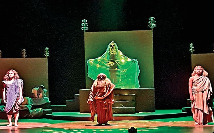 नाटक में अंधे राजा धृतराष्ट्र और आंखों पर पट्टी बांधे गांधारी कोई मिथक नहीं हैं, बल्कि ये आधुनिक राजनीति व्यवस्था के यथार्थ को निरूपित करते हैं. नाटक में दो प्रहरी जिस तरह सत्ता का परिहास उड़ाते हैं, वह आम आदमी की वेदना और त्रासदी को उजागर करता है. राम गोपाल बजाज ने मंच की परिकल्पना सादगी से की है. उन्होंने अपने वक्तव्य में कहा कि ‘इसे एक ऐसा नाटक बनाने की कोशिश कर रहा हूं कि यह प्रोसीनियम व अन्य सभी जगहों पर आसानी से खेला जा सके.’