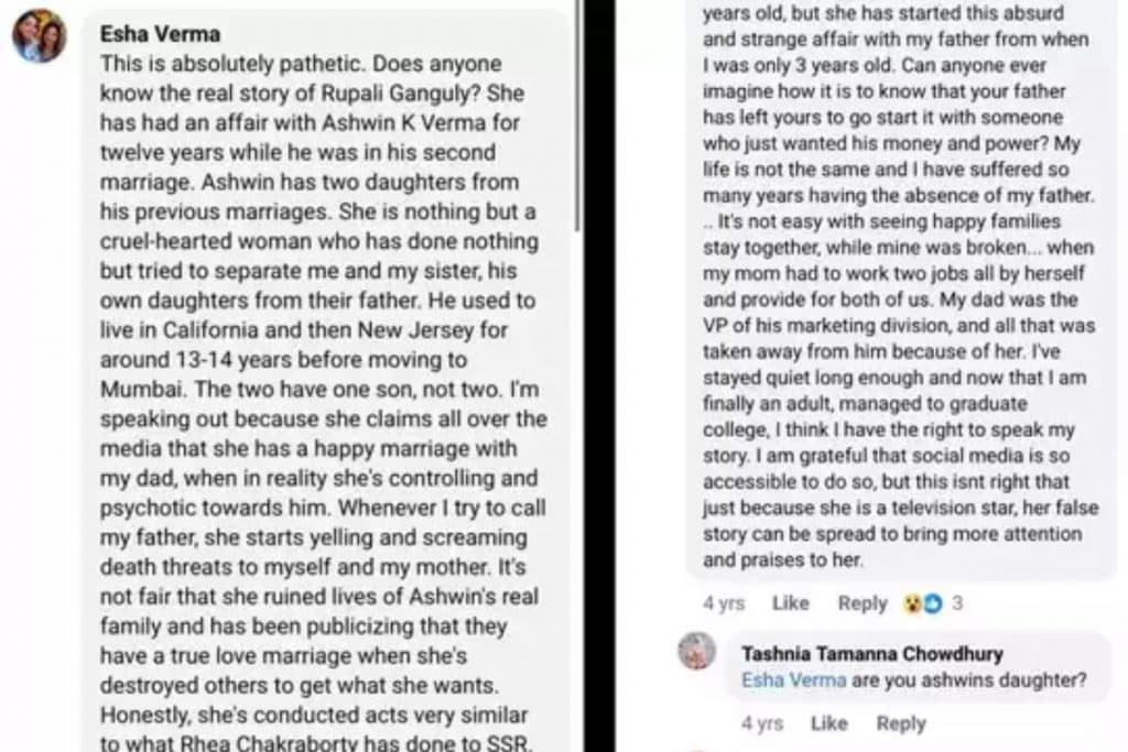 दरअसल, रूपाली गांगुली के हसबैंड अश्विन की पहली शादी सपना वर्मा से हुई थी और उनकी दो बेटी भी है. जिसके बाद अश्विन और रुपाली ने साल 2013 में शादी कर ली. कपल का एक बेटा भी है. अश्विन और सपना की बेटी का नाम ईशा वर्मा है. ईशा का Reddit पर एक पोस्ट सोशल मीडिया पर वायरल हो रहा है. पोस्ट में उसने कई चौंकाने वाली बातें भी लिखी है. हालांकि इस पोस्ट में कितनी सच्चाई है, इसकी जानकारी सामने नहीं आई है. पोस्ट के अनुसार, क्या कोई रुपाली गांगुली की असली स्टोरी जानता है? अश्विन के वर्मा के साथ उनका 12 साल तक अफेयर चला. अश्विन की दो बेटियां है पहली शादी से.