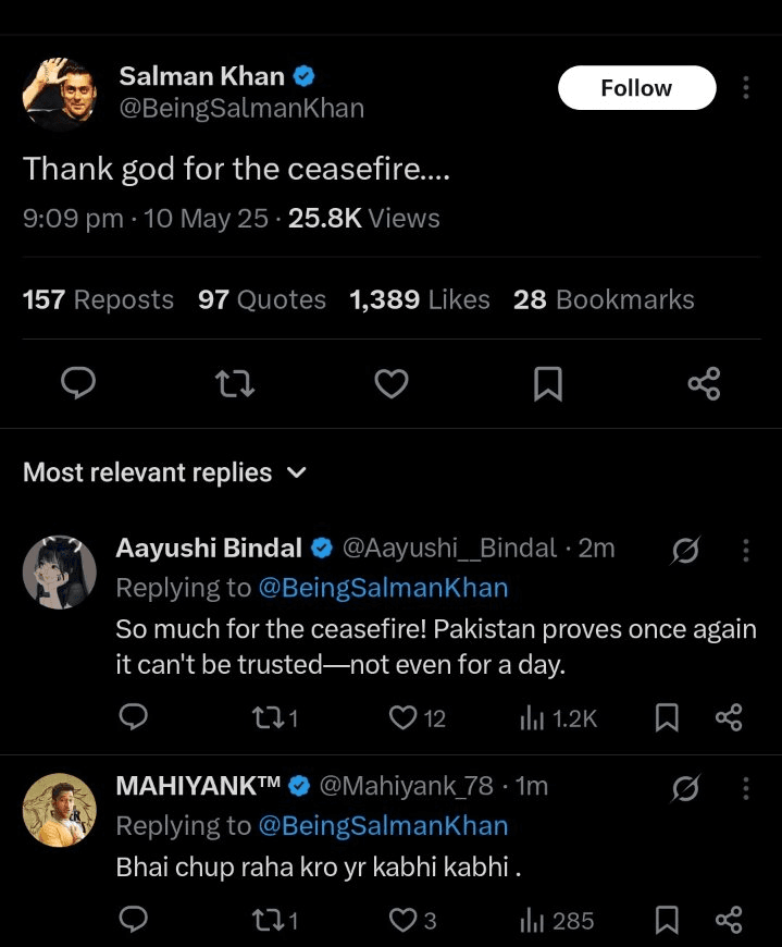 सलमान खान का यह ट्वीट सोशल मीडिया पर हलचल का कारण बना. एक ओर जहां कुछ लोग सलमान की इस प्रतिक्रिया को सकारात्मक मानते हुए सीजफायर का स्वागत कर रहे थे, वहीं दूसरी ओर कई यूजर्स ने उन्हें आड़े हाथों लिया. इन यूजर्स का कहना था कि जब भारतीय सेना ने ऑपरेशन सिंदूर चलाया था, तब सलमान ने कोई प्रतिक्रिया नहीं दी थी, लेकिन जैसे ही सीजफायर की घोषणा हुई, उन्होंने ट्वीट किया और बाद में उसे डिलीट कर दिया. एक यूजर ने ट्वीट किया, “सीजफायर उतनी देर चला जितना सलमान खान की फिल्म थिएटर में चलती है.”