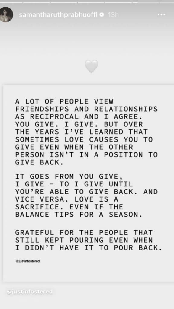 दरअसल सामंथा रुथ प्रभु ने इंस्टाग्राम स्टोरी पर एक पोस्ट शेयर किया, जिसमें उन्होंने लिखा, ‘प्यार एक बलिदान है’. आगे लिखा था, कैसे कभी-कभी एक साथी को ज्यादा ट्राई करने की जरुरत होती है, जब दूसरा साथी बहुत अधिक देने की ‘स्थिति में’ नहीं होता है. पोस्ट के माध्यम से, सामंथा ने अपने जीवन में उन लोगों का ‘आभार’ भी व्यक्त किया, जिन्होंने तब उनका साथ दिया जब वह काफी लो फील करती थी. इस पोस्ट को एक्ट्रेस ने व्हाइट हार्ट इमोजी के साथ शेयर किया.