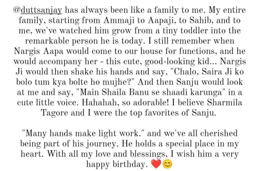 उन्होंने युवा संजय और उनकी दिवंगत मां नरगिस दत्त के साथ अपनी प्यारी यादों को याद करते हुए लिखा कि, “मुझे अभी भी याद है जब नरगिस आपा हमारे घर फंक्शन के लिए आती थीं, और वह उनके साथ आता था – यह प्यारा, अच्छा दिखने वाला बच्चा… नरगिस जी फिर उससे हाथ मिलाती थीं और कहती थीं, “चलो, सायरा जी को बोलो तुम क्या बोलते हो मुझे?” और फिर संजू मेरी तरफ देखते और प्यारी सी आवाज में कहते, ‘मैं शैला बानो से शादी करूंगा’. हाहाहा, कितना प्यारा! मुझे लगता है कि शर्मिला टैगोर और मैं संजू के सबसे पसंदीदा थे.”