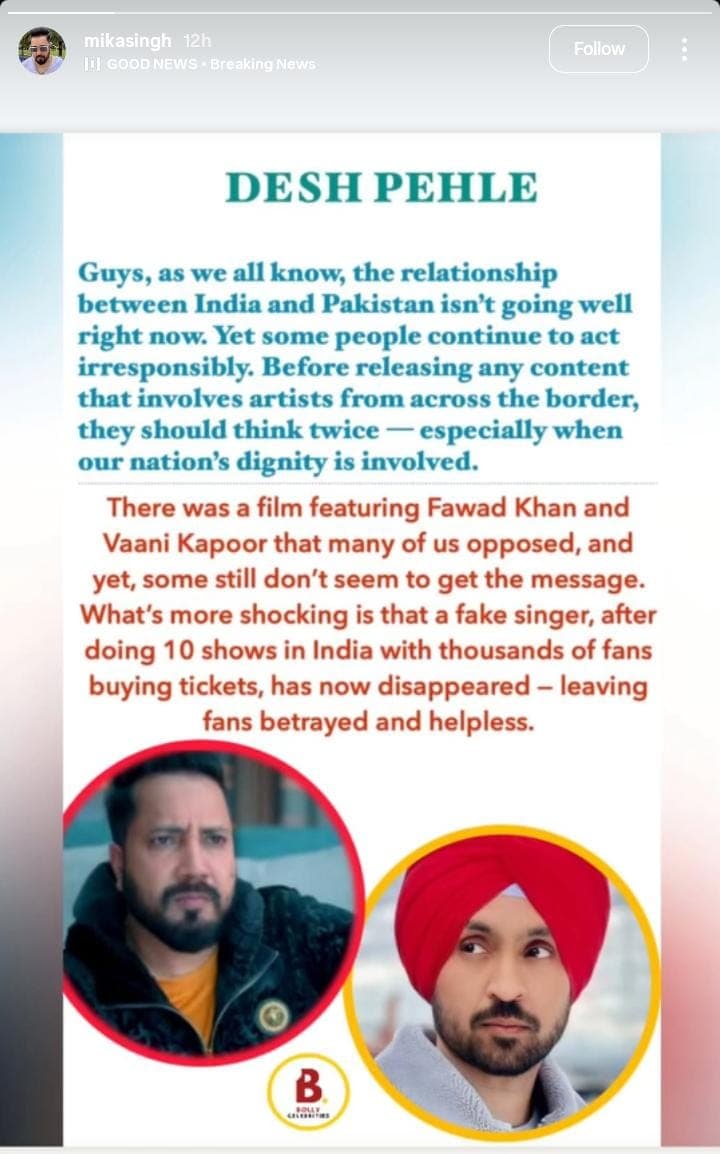 फिल्म को लेकर हाल ही में मशहूर सिंगर मीका सिंह ने अपने इंस्टाग्राम अकाउंट पर एक स्टोरी शेयर करते हुए दिलजीत दोसांझ की आलोचना की. मीका ने कहा, “सब जानते हैं कि इस वक्त भारत और पाकिस्तान के बीच हालात सही नहीं हैं, फिर भी कुछ लोग गैरजिम्मेदार फैसले ले रहे हैं. जब देश के सम्मान की बात हो, तो हर कलाकार को दो बार सोचना चाहिए.” मीका ने दिलजीत को ‘फेक सिंगर’ तक कह डाला और कहा, “ये वही लोग हैं जो इंडिया में 10 शो कर लाखों-करोड़ों कमाकर निकल जाते हैं और जब इनसे जवाब देने की बारी आती है, तो चुप्पी साध लेते हैं. फैंस को धोखा देना बहुत बड़ा अपराध है.”