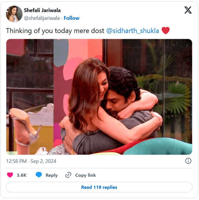 एक्स (पूर्व में ट्विटर) पर उनकी आखिरी पोस्ट उनके बिग बॉस 13 के सह-प्रतियोगी और पूर्व साथी सिद्धार्थ शुक्ला को भावभीनी श्रद्धांजलि थी. रियलिटी शो के तेरहवें सीजन के विजेता सिद्धार्थ का 2021 में इसी तरह की परिस्थितियों में कार्डियक अरेस्ट के कारण निधन हो गया था. उनकी पुण्यतिथि पर, शेफाली जरीवाला ने बिग बॉस के दौरान दोनों के गले मिलते हुए एक थ्रोबैक फोटो शेयर की और लिखा, “आज तुम्हारे बारे में सोच रही हूं, मेरे दोस्त @sidharth_shukla.”