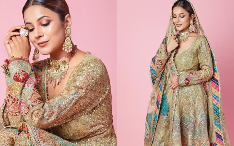 शहनाज गिल ने कढ़ाई वाला सुनहरा शरारा पहना हुआ है और हैवी ज्वेलरी कैरी किया हुआ है. साथ ही बालों का बन बनाया हुआ है और मिनिमल मेकअप किया हुआ है. कैमरे को देखकर सना अलग-अलग अदा में पोज में दे रही है.