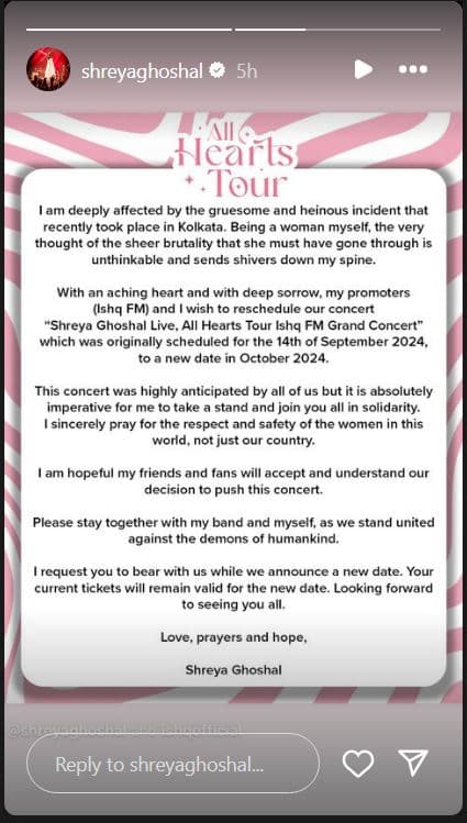 श्रेया घोषाल का कॉन्सर्ट, कोलकाता के नेताजी इंडोर स्टेडियम में होने वाला था. टिकटों की कीमत 1749 से शुरू है. आयोजकों ने अपनी वेबसाइट पर कहा, “यह कार्यक्रम रि-शेड्यूल किया गया है, लेकिन अपडेट के लिए इस स्थान पर नजर रखें. श्रेया ने अपने नोट में आगे कहा, “इस कॉन्सर्ट का हम सभी को काफी इंतजार था, लेकिन मेरे लिए एक स्टैंड लेना और आप सभी के साथ एकजुटता से जुड़ना बेहद जरूरी है. मैं ईमानदारी से हमारे देश ही नहीं, बल्कि इस दुनिया में महिलाओं के सम्मान और सुरक्षा के लिए प्रार्थना करती हूं.”