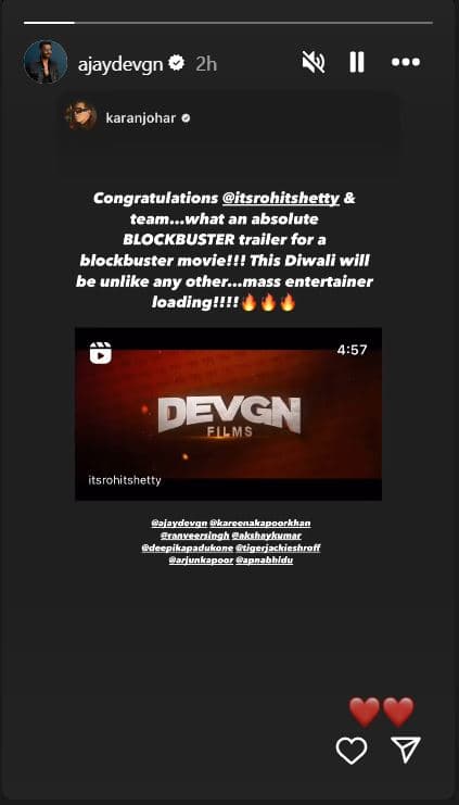 करण ने अपनी इंस्टाग्राम स्टोरीज पर ट्रेलर शेयर किया और लिखा, ”बधाई @itsrohitshetty और टीम… एक ब्लॉकबस्टर फिल्म के लिए क्या ब्लॉकबस्टर ट्रेलर है!!! यह दिवाली काफी खास होने वाली है…मास एंटरटेनर लोडिंग!!!” उनके पोस्ट पर रिएक्ट करते हुए अजय देवगन ने दिल वाले इमोजी बनाए, इससे पहले आलिया ने भी ट्रेलर की तारीफ करते हुए लिखा था, ”नेक्स्ट लेवल!!!!” सभी डायनामाइट को एक फ्रेम में देखें!!