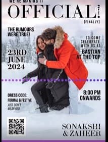 सोनाक्षी सिन्हा और जहीर इकबाल ऑडियो मैसेज के आखिरी में कहते हैं, “फाइनली! यह जश्न आपके बिना पूरा नहीं होगा, इसलिए 23 जून को आप जो भी कर रहे हैं, उसे छोड़ दें और हमारे साथ पार्टी में आएं. वहां मिलते हैं.” इस इनवाइट के अनुसार, कपल शिल्पा शेट्टी के मुंबई स्थित रेस्टोरेंट बैस्टियन में शादी करेंगे. शादी में ड्रेस कोड फॉर्मल है. गौरतलब है कि सोनाक्षी हाल ही में लीला भंसाली की वेब सीरीज हीरामंडी में दिखी थी. सीरीज में हर किसी ने उनके एक्टिंग की सराहना की थी. ये 1 मई को नेटफिल्क्स पर रिलीज हुई थी.