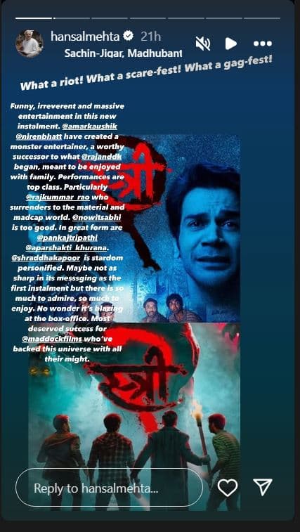 प्रसिद्ध फिल्म निर्माता हंसल मेहता ने भी हॉरर कॉमेडी फिल्म स्त्री 2 का रिव्यू किया है. हंसल ने इंस्टाग्राम स्टोरी पर लिखा, ”क्या दंगा है! क्या मजाक है! क्या उत्सव है! इस नई सीक्वल में मजेदार और अनलिमिटेड मस्ती है. @amakaushik @nirenbhat ने एक शानदार मनोरंजन फिल्म बनाई है, जो @rajanddk की शुरुआत का एक योग्य उत्तराधिकारी है, जिनका उद्देश्य परिवार के साथ आनंद लेना है.”