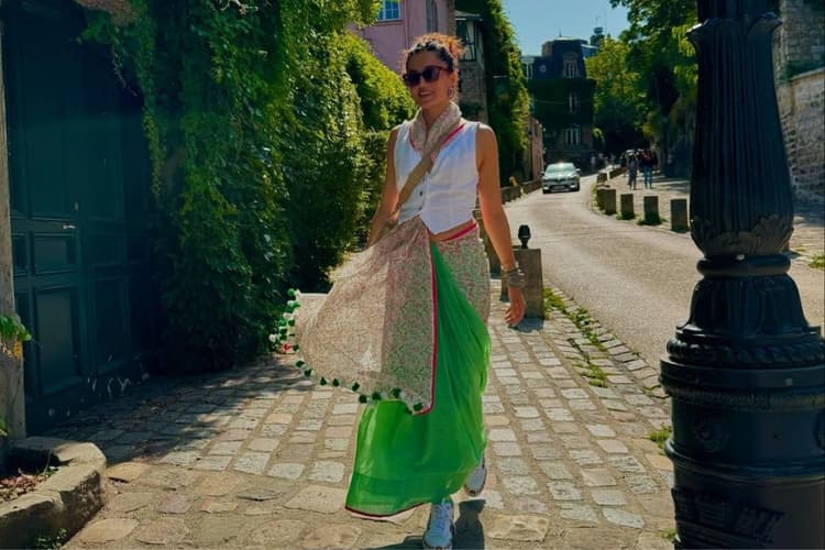 तापसी पन्नू की शेयर की गई पोस्ट के पहले पिक्चर में वह पेरिस की सड़कों के बीच में पोज करते नजर आ रही हैं. एक्ट्रेस ने लाइट ग्रीन रंग की साड़ी को अलग ढंग से ड्रेप किया है और एक क्रॉप टॉप के साथ पेयर किया है और बालों का जुड़ा बनाया हुआ है. और उनके इस पूरे लुक को कंप्लीट करने के लिए उन्होंने स्नीकर्स पहने हैं, जिसमें वह काफी स्टाइलिश लग रही हैं.