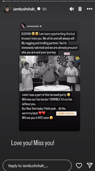 तारक मेहता का उल्टा चश्मा में बबीता जी की भूमिका निभाने वाली मुनमुन दत्ता ने कुश शाह के नाम भावुक पोस्ट लिखा है. उन्होंने अपनी इंस्टा स्टोरी पर कुश का वीडियो शेयर कर लिखा, मैं ये लिखते वक्त इमोशनल हो गई है और मैं आपको मिस करूंगी. हम लोग सब आपको मिस करेंगे. मेरे रैंगिग और ट्रोलिंग पार्टनर. आप बहुत ज्यादा टैलैंटेट है और हमलोगों को आपकी जर्नी पर गर्व है. साथ ही एक्ट्रेस ने लिखा कि, काश मैं भी आपके फेयरवेल पार्टी की हिस्सा होती. उन्होंने उनके न्यूयॉर्क जाने पर बधाई दी और ऑल द बेस्ट कहा. वहीं, उनके पोस्ट से साफ है कि कुश शाह न्यूयॉर्क जा रहे हैं, इसलिए उन्होंने शो को अलविदा कह दिया. वो अपनी पढ़ाई के लिए वहां जा रहे हैं.