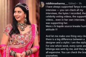 रिद्धिमा ने सोशल मीडिया पर एक लंबा पोस्ट शेयर करते हुए कहा कि उन्होंने तान्या मित्तल के हर आउटफिट को तैयार और समय पर भेजा, लेकिन इसके बावजूद उन्हें सही सम्मान और भुगतान नहीं मिला. उन्होंने बताया, “मैंने तान्या का हर इंटरव्यू और वीडियो शूट में समर्थन किया. मैंने पूरे सप्ताह के लिए हर साड़ी और लहंगा भेजा, और ये सभी महंगे ब्रांड के थे. फिर भी उनके टीम ने सम्मान नहीं दिया.”