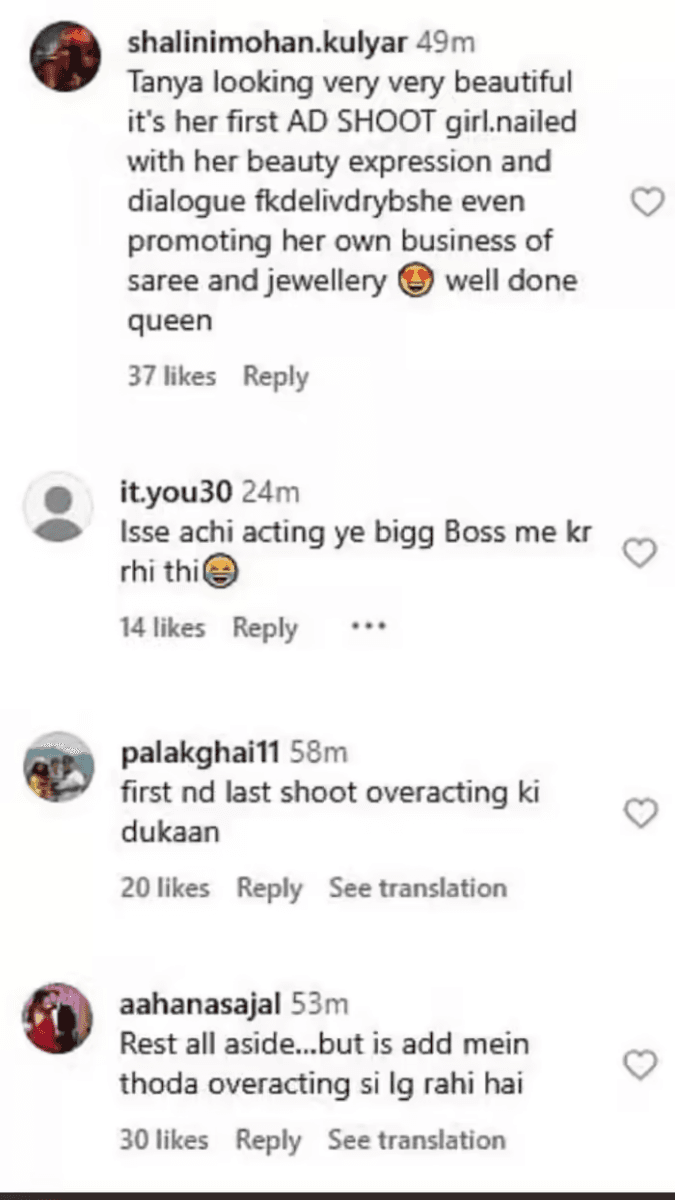 वीडियो पर रिएक्शन देते हुए एक यूजर ने लिखा कि तान्या बेहद खूबसूरत लग रही हैं और पहले ऐड में ही उन्होंने शानदार काम किया है. वहीं दूसरे यूजर ने तंज कसते हुए कहा कि शुरुआत से आखिर तक ओवरएक्टिंग ही दिखी. किसी ने कहा कि ऐड में एक्टिंग फेक लग रही है, तो किसी का मानना है कि बिग बॉस में उनकी एक्टिंग इससे बेहतर थी. कुछ लोगों ने तो यहां तक कह दिया कि तान्या अभी भी बिग बॉस वाला गेम ही खेल रही हैं.