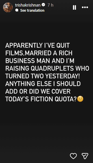 तृषा कृष्णन ने इंस्टाग्राम पर एक स्टोरी शेयर करते हुए लिखा,“मैंने फिल्मों को छोड़ दिया, एक अमीर बिजनेसमैन से शादी कर ली और चार बच्चों की मां बन गई, जो अब दो साल के हो गए हैं! और कुछ जोड़ना है?”