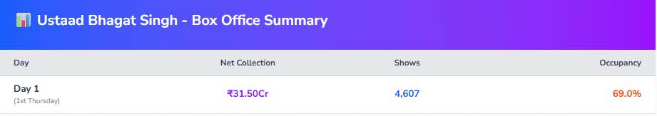 Sacnilk के रिपोर्ट के अनुसार रिलीज के पहले दिन ‘उस्ताद भगत सिंह’ ने बॉक्स ऑफिस पर शानदार प्रदर्शन करते हुए करीब 31.50 करोड़ रुपये (नेट) का कलेक्शन किया. यह आंकड़ा फिल्म की मजबूत ओपनिंग को दर्शाता है. बड़ी संख्या में शो और ऑक्यूपेंसी ने भी इसकी कमाई को बढ़ाने में अहम भूमिका निभाई.