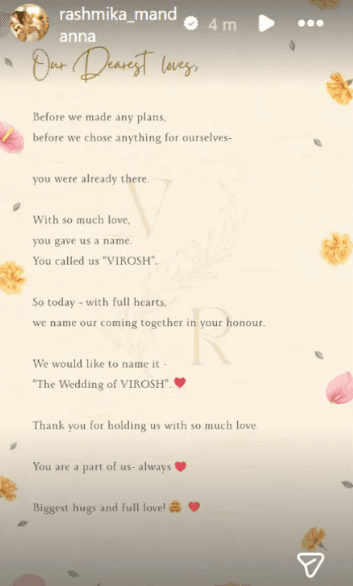 विजय और रश्मिका ने एक भावुक नोट शेयर करते हुए लिखा कि जब उन्होंने अपने लिए कुछ भी तय नहीं किया था, उससे पहले ही फैंस ने उन्हें “VIROSH” नाम दिया था. इसी प्यार और अपनापन को सम्मान देने के लिए उन्होंने अपनी शादी का नाम भी यही रखने का फैसला किया है. दोनों ने कहा कि फैंस हमेशा उनके दिल के बेहद करीब हैं और इस खास मौके पर वे उन्हें भी अपने साथ महसूस करना चाहते हैं.