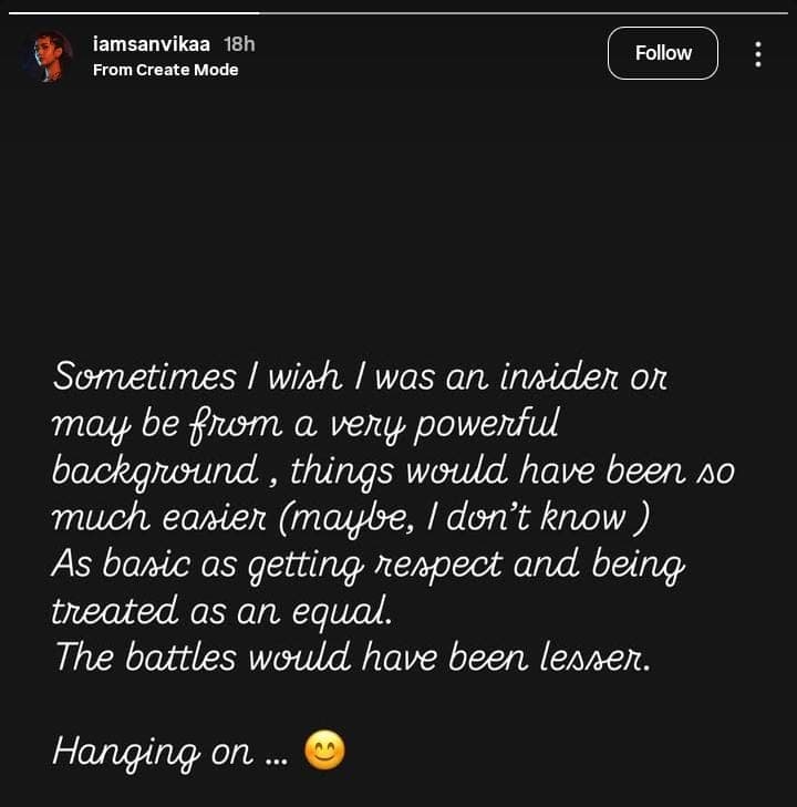 सांविका ने अपने इंस्टाग्राम पर एक स्टोरी पोस्ट किया जिसमें उन्होंने लिखा, ‘कभी-कभी लगता है कि काश मैं किसी खास या ताकतवर परिवार से होती, तो शायद मेरे लिए जिंदगी आसान होती. कम से कम लोग मुझे इज्जत देते और बराबरी से देखते. जिंदगी से लड़ाइयां भी कम होती. बस, मैं जैसे-तैसे संभल रही हूं.’ सांविका ने अपने इस पोस्ट में इंडस्ट्री से मिल रहे आउटसाइडर ट्रीटमेंट पर यह पोस्ट शेयर किया है, हालांकि उन्होंने किसी भी घटना का जिक्र नहीं किया है.
