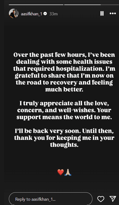 आसिफ खान ने अपने इंस्टाग्राम पर एक स्टोरी शेयर करते हुए लिखा, “पिछले कुछ घंटों से, मैं कुछ स्वास्थ्य समस्याओं से जूझ रहा हूँ जिनके लिए मुझे अस्पताल में भर्ती होना पड़ा. मुझे यह बताते हुए खुशी हो रही है कि अब मैं ठीक हो रहा हूं और बहुत बेहतर महसूस कर रहा हूं. मैं आपके प्यार, चिंता और शुभकामनाओं के लिए सचमुच आभारी हूं. आपका समर्थन मेरे लिए बहुत मायने रखता है. मैं बहुत जल्द वापस आऊंगा. तब तक, मुझे अपने विचारों में रखने के लिए धन्यवाद.”