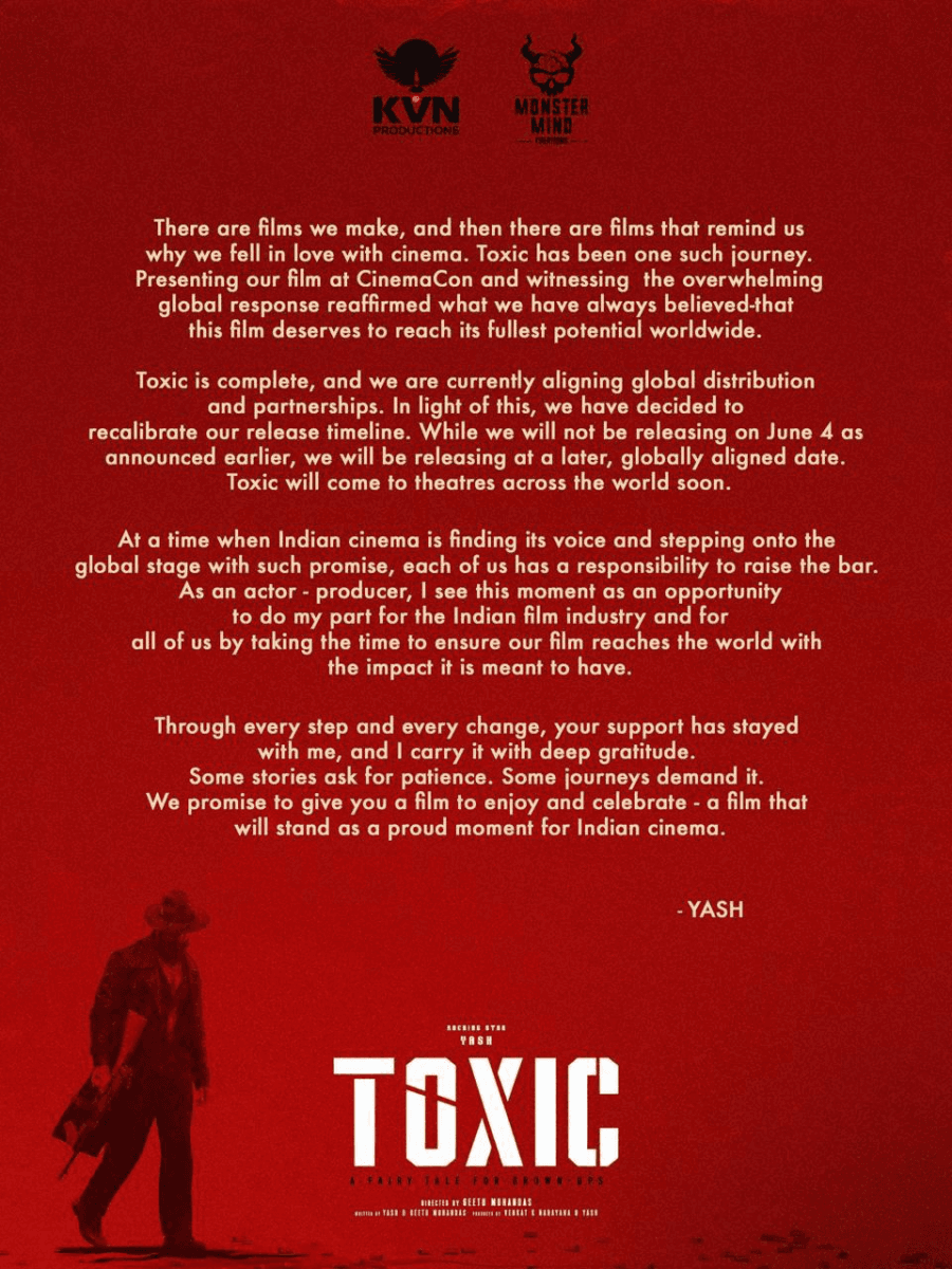 Toxic: साउथ सुपरस्टार यश की मच अवेटेड फिल्म Toxic: A Fairy Tale for Grown-Ups को लेकर बड़ा अपडेट सामने आया है. मेकर्स ने फिल्म की रिलीज डेट को आगे बढ़ाने का फैसला किया है. पहले यह फिल्म 4 जून 2026 को सिनेमाघरों में रिलीज होने वाली थी, लेकिन अब इसे नई तारीख पर दुनिया भर में रिलीज किया जाएगा. हालांकि नई रिलीज डेट की घोषणा अभी नहीं की गई है.