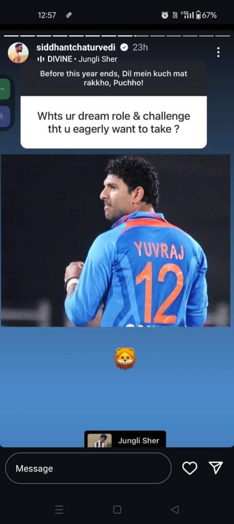 सिद्धांत चतुर्वेदी ने इंस्टाग्राम पर नेटिजन्स संग एक सेशन रखा. जिसमें एक फैन ने उनके पूछा कि उनका ड्रीम रोल क्या होगा. इसका जवाब देते हुए, सिद्धांत ने नीली जर्सी में क्रिकेटर युवराज सिंह की एक तस्वीर शेयर की और एक शेर इमोजी जोड़ा. स्टोरी देखकर फैंस एक्साइटेड हो गए कि एक्टर युवराज सिंह की कहानी बड़े पर्दे पर लेकर आने वाले हैं.