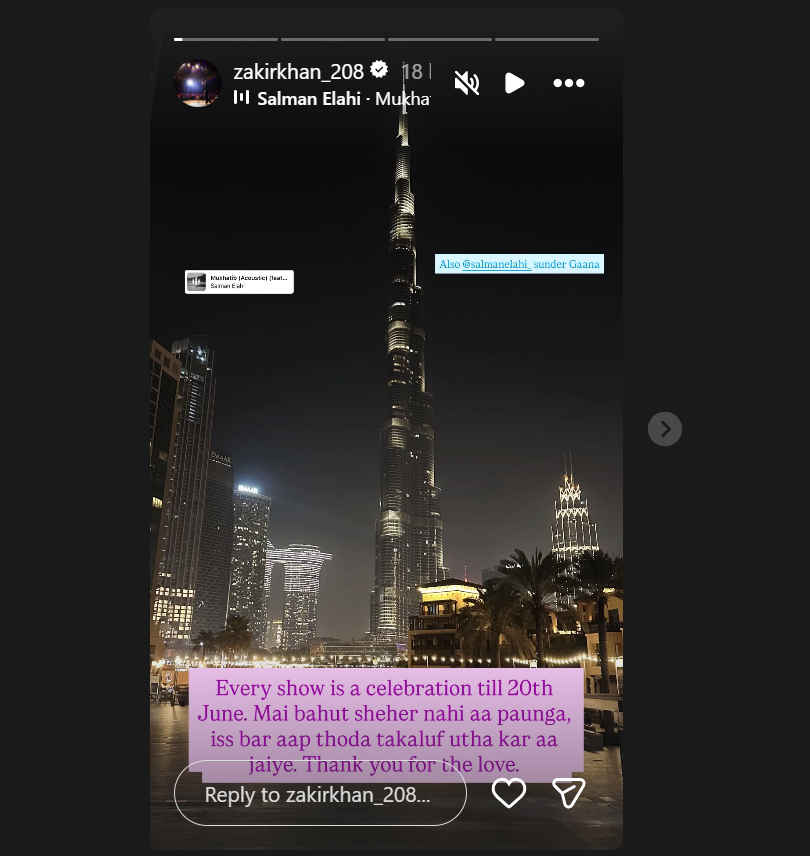 इस अनाउंसमेंट के बाद जाकिर ने इंस्टाग्राम पर भी एक पोस्ट शेयर की. इसमें उन्होंने लिखा कि 20 जून तक होने वाला हर शो उनके लिए किसी त्योहार से कम नहीं है. उन्होंने फैंस से अपील की कि अगर उनके शहर में शो नहीं है, तो थोड़ा एक्स्ट्रा एफर्ट करके जरूर आएं. पोस्ट के बाद फैंस ने जमकर प्यार लुटाया, लेकिन कई लोग ये सोचकर उदास भी दिखे कि अब लंबे वक्त तक जाकिर को लाइव परफॉर्म करते नहीं देख पाएंगे.