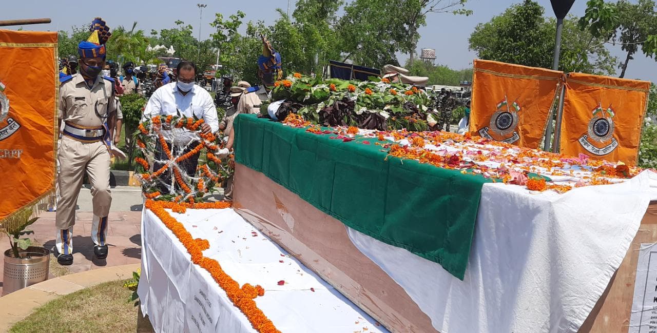 Handwara, Terrorist Attack, Latest Photos Update from Gaya: बोधगया : उत्तरी कश्मीर के हंदवाड़ा में सोमवार की शाम आतंकी हमले में शहीद हुए औरंगाबाद जिले के गोह थाना क्षेत्र के देवहरा गांव निवासी जवान संतोष कुमार मिश्रा का शव बुधवार की सुबह विशेष विमान से गया एयरपोर्ट पर पहुंचा. गया एयरपोर्ट पर सीआरपीएफ के आईजी, डीआईजी, कमांडेंट सहित गया के जिलाधिकारी अभिषेक सिंह, एसएसपी राजीव मिश्रा, सिटी एसपी राकेश कुमार सहित सीआईएसएफ के अधिकारियों और जवानों ने सलामी दी. इसके बाद शहीद के पार्थिव शरीर को औरंगाबाद स्थित शहीद के गांव रवाना कर दिया.