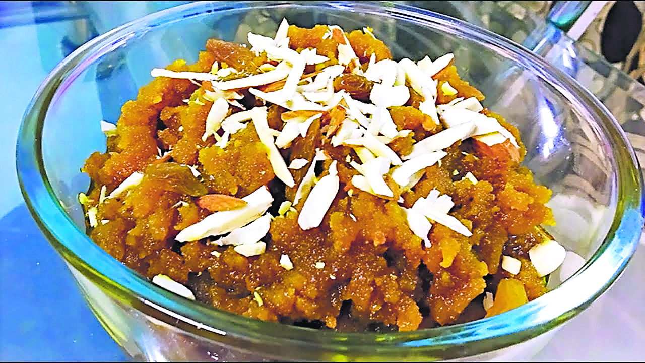 अब एक सर्विंग बाउल में तैयार हलवा निकालकर उसके ऊपर काजू, बादाम, पिस्ता की कतरनें और मगज के बीज और किशमिश से गार्निश करें.