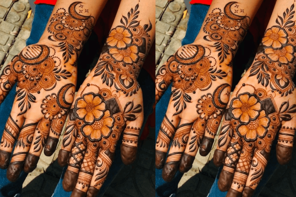 यह डिज़ाइन उन दुल्हनों के लिए बेस्ट है, जो हाथों पर ज्यादा भरा हुआ डिज़ाइन नहीं चाहतीं. इसमें हाथों के सेंटर में एक बड़ा फूल बनाया जाता है और उसके चारों ओर छोटे-छोटे पैटर्न्स बनाए जाते हैं. यह मेहंदी देखने में बेहद सुंदर लगती है और इसे जल्दी लगाया जा सकता है.