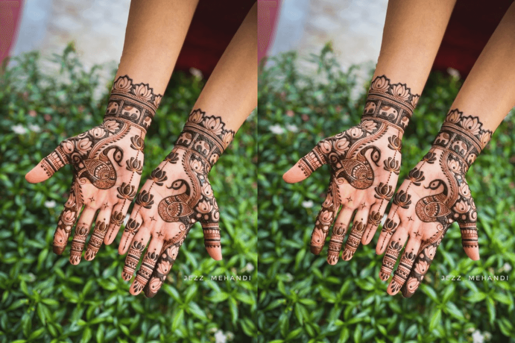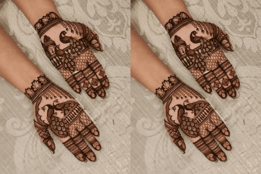 मोर भारतीय परंपरा का एक खास हिस्सा है और इसका डिज़ाइन दुल्हन की मेंहदी में चार चांद लगा देता है. मोर की आकृति और उसके खूबसूरत पंख हाथों की सुंदरता को बढ़ाते हैं. यह डिजाइन मॉडर्न और ट्रेडिशनल दोनों तरह की दुल्हनों के लिए परफेक्ट ऑप्शन है.