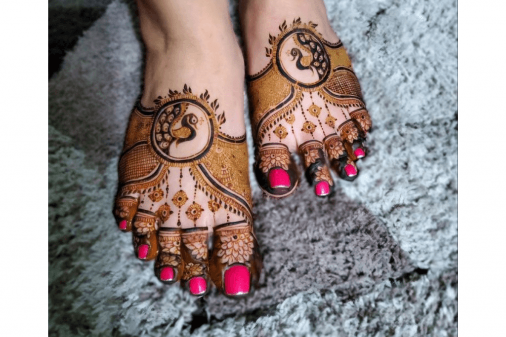 मोर से प्रेरित यह डिजाइन राजस्थानी और ट्रेडिशनल लुक देता है. इसमें मोर की आकृति को पैरों के बीच उकेरा जाता है और आसपास जाली व बेल डिजाइन बनाए जाते हैं. यह ब्राइडल मेहंदी के लिए भी अच्छा विकल्प है.