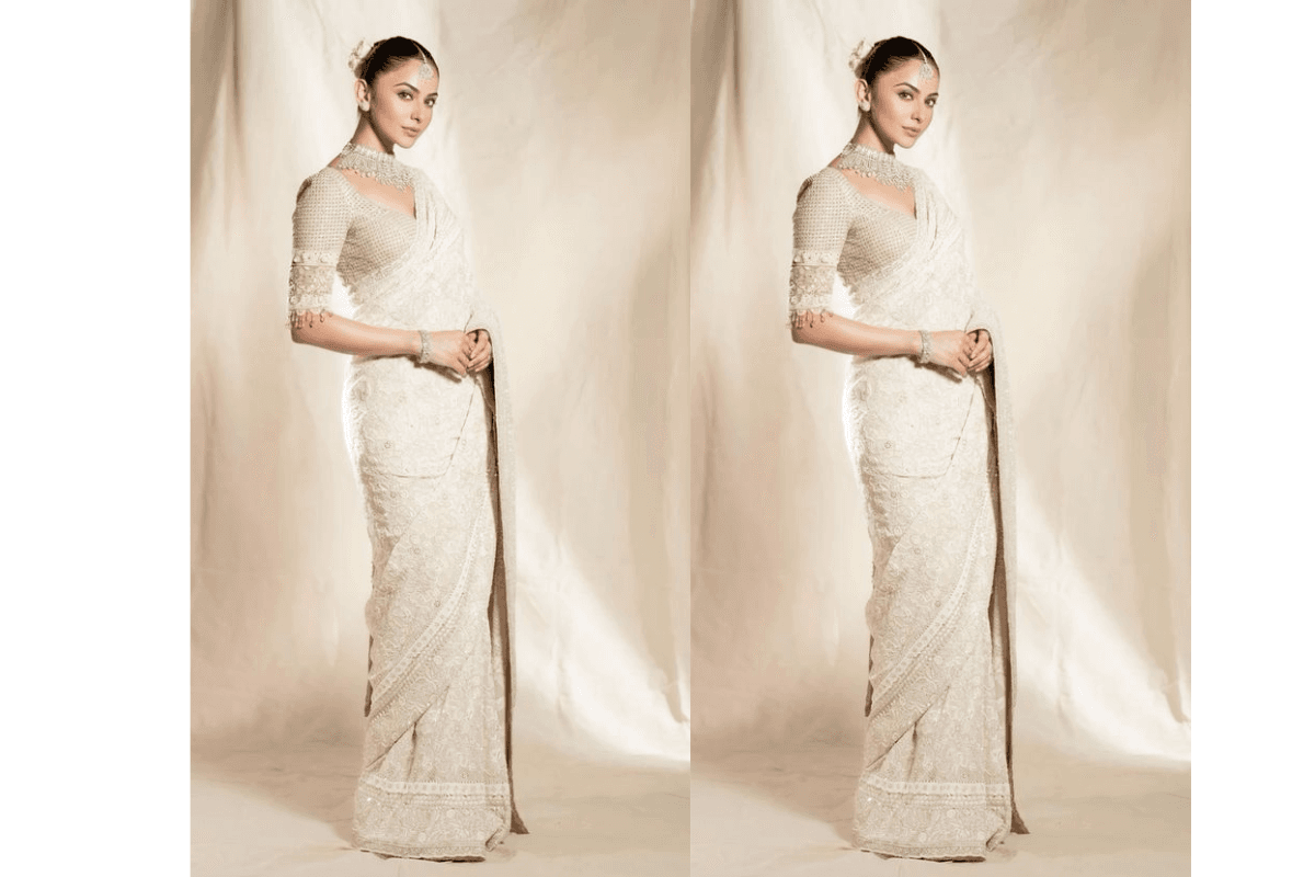 3. रकुल प्रीत की व्हाइट एंब्रॉइडरी साड़ी लुक
