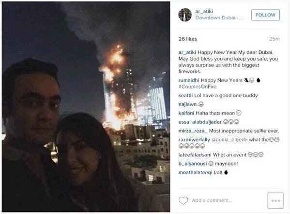 इस सेल्फी के पीछे दुबई के डाउनटाउन होटल में लगी आग साफ दिख रही है. गौरतलब है कि नए साल के स्वागत में होटल में हो रहे जश्न के दौरान 63 मंजिला होटल में आग लग गई थी. नया साल शुरू होने से करीब तीन घंटे पहले यह आग फैल गई थी.