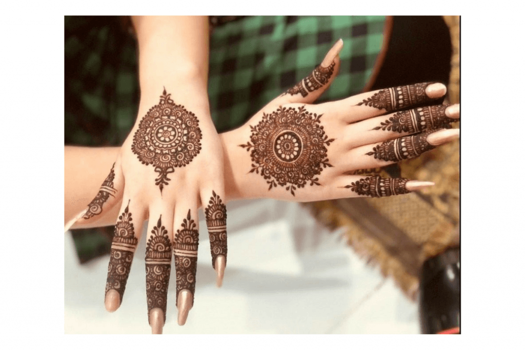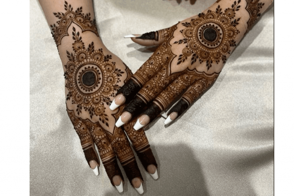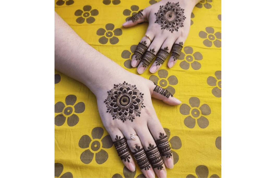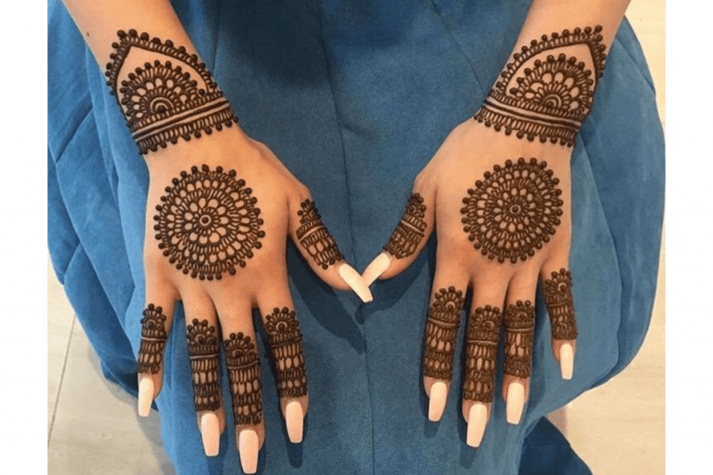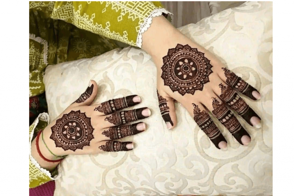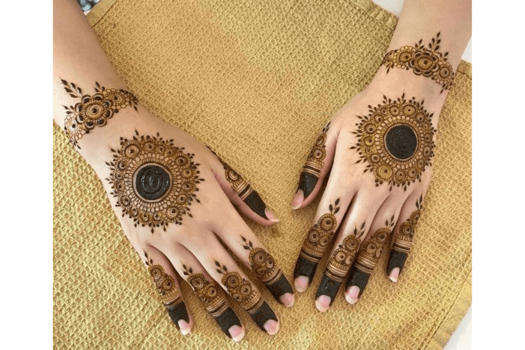 यह डिजाइन एक बड़े गोल मांडला पैटर्न के साथ शुरू होती है और उंगलियों तक फैली हुई होती है. यह मिनिमल लुक के साथ भी बेहद आकर्षक लगती है.