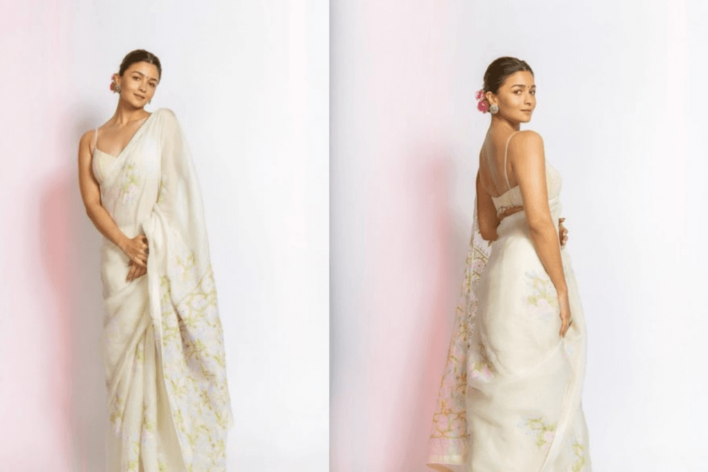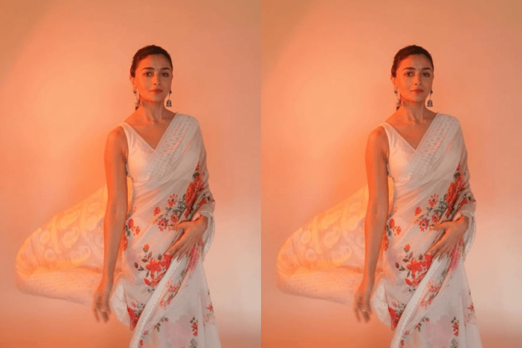 अगर आप होली पर हल्का और फ्रेश लुक चाहती हैं तो आलिया भट्ट की व्हाइट फ्लोरल साड़ी परफेक्ट चॉइस हो सकती है. हल्के गुलाबी और हरे रंग के फ्लोरल प्रिंट वाली यह साड़ी आपको एलिगेंट और क्लासी लुक देगी. इसे आप स्लीवलेस या एंब्रॉयडरी ब्लाउज के साथ पेयर कर सकती हैं.