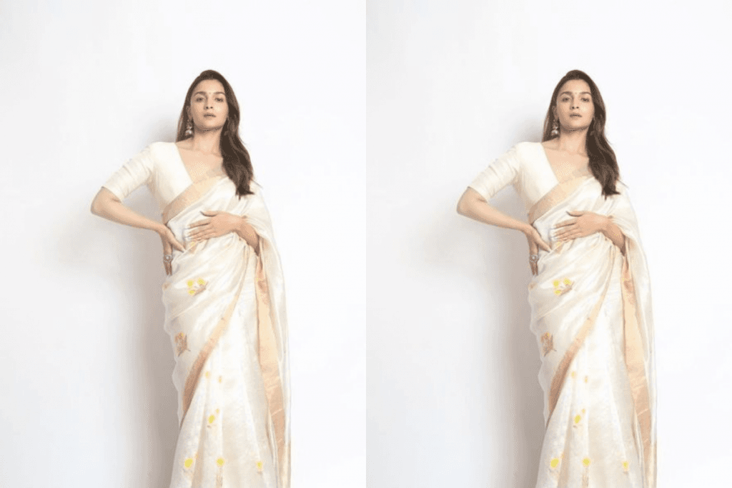 अगर आप ग्रेसफुल और शाइनी लुक चाहती हैं, तो आलिया की व्हाइट नेट साड़ी विद गोल्डन फ्लोरल बॉर्डर आपके लिए परफेक्ट ऑप्शन हो सकती है. यह साड़ी आपको रॉयल और ट्रेडिशनल लुक देने के साथ-साथ पार्टी रेडी भी बना सकती है. इसे गोल्डन ब्लाउज और मैचिंग ईयररिंग्स के साथ स्टाइल करें.