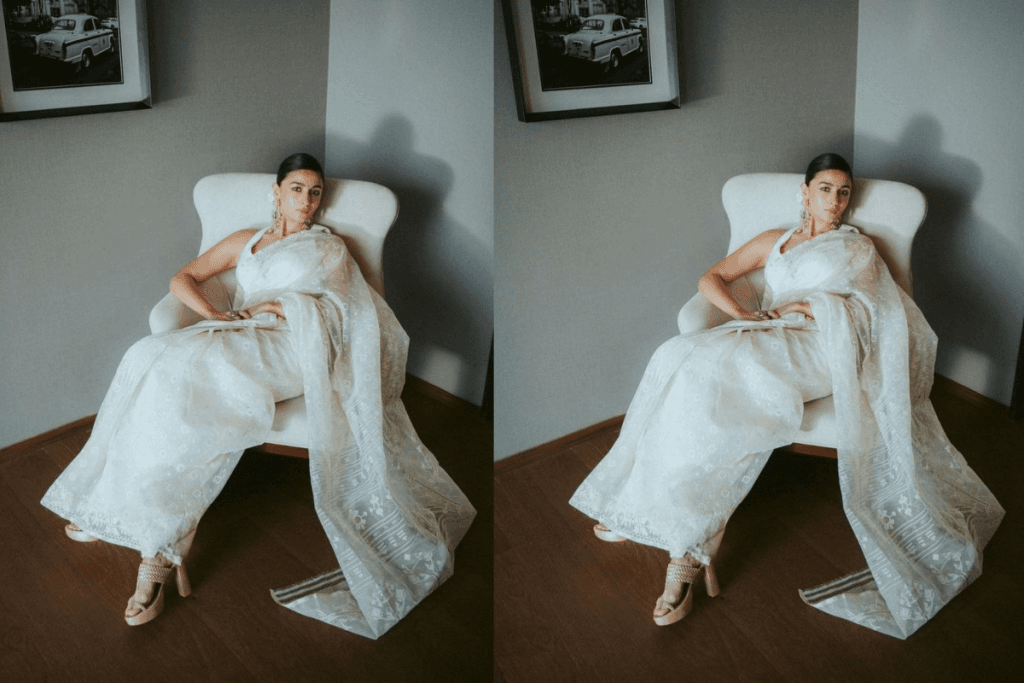 साटन की साड़ी का ग्लॉसी और रिच लुक हर किसी को पसंद आता है. आलिया भट्ट की व्हाइट साटन साड़ी के साथ ब्लैक बोल्ड बॉर्डर उनके लुक को काफी आकर्षक बनाता है. यह लुक सिंपल लेकिन स्टाइलिश है, जिसे आप ब्लैक डीप नेक ब्लाउज के साथ पेयर कर सकती हैं. मिनिमल ज्वेलरी और स्मोकी आई मेकअप से आपका लुक और भी ग्लैमरस लगेगा.