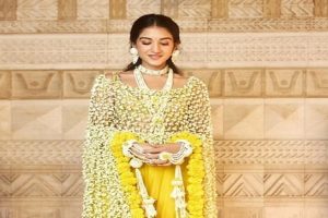 हल्दी समारोह में राधिका का लुक बहुत सुंदर था. उन्होंने एक डिजाइनर लहंगा-चोली पहना था, जिस पर फूलों की सजावट की गई थी, साथ ही फूलों से बना दुपट्टा भी था जो उनकी खूबसूरती में चार चांद लगा रहा था. सफेद और पीले फूलों से बना दुपट्टा इस अवसर के लिए एकदम सही था. भारी दुल्हन के गहनों के बजाय, राधिका ने अपने लुक को पूरा करने के लिए फूलों के गहने चुने थे.