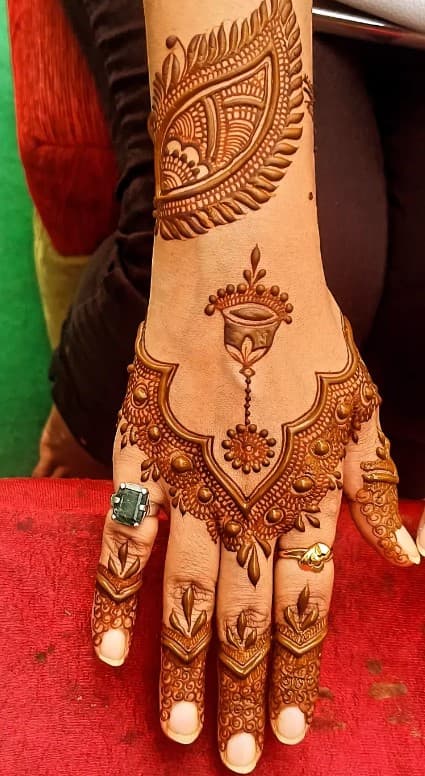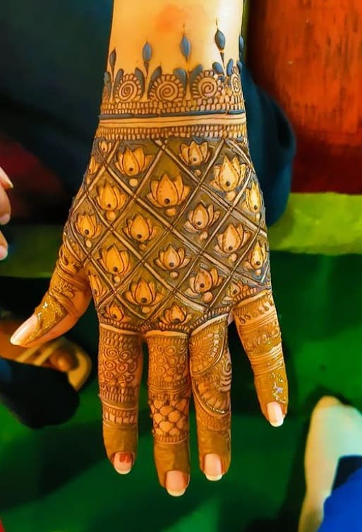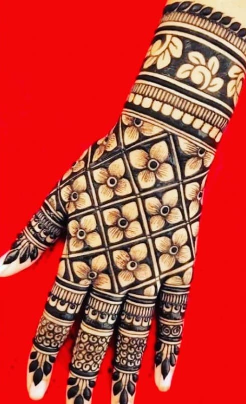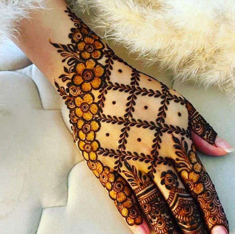 आप अपने बैक हैन्ड पर ये वर्गाकार स्टाइल की मेहंदी डिजाइन भी लगा सकते हैं, ये मेहंदी डिजाइन लगाने में आसान होती है और पारंपरिक कपड़ों के साथ बहुत सुंदर लगती हैं.