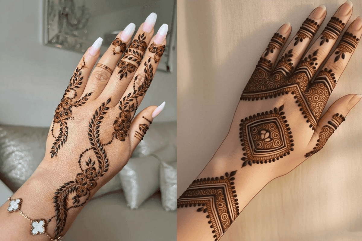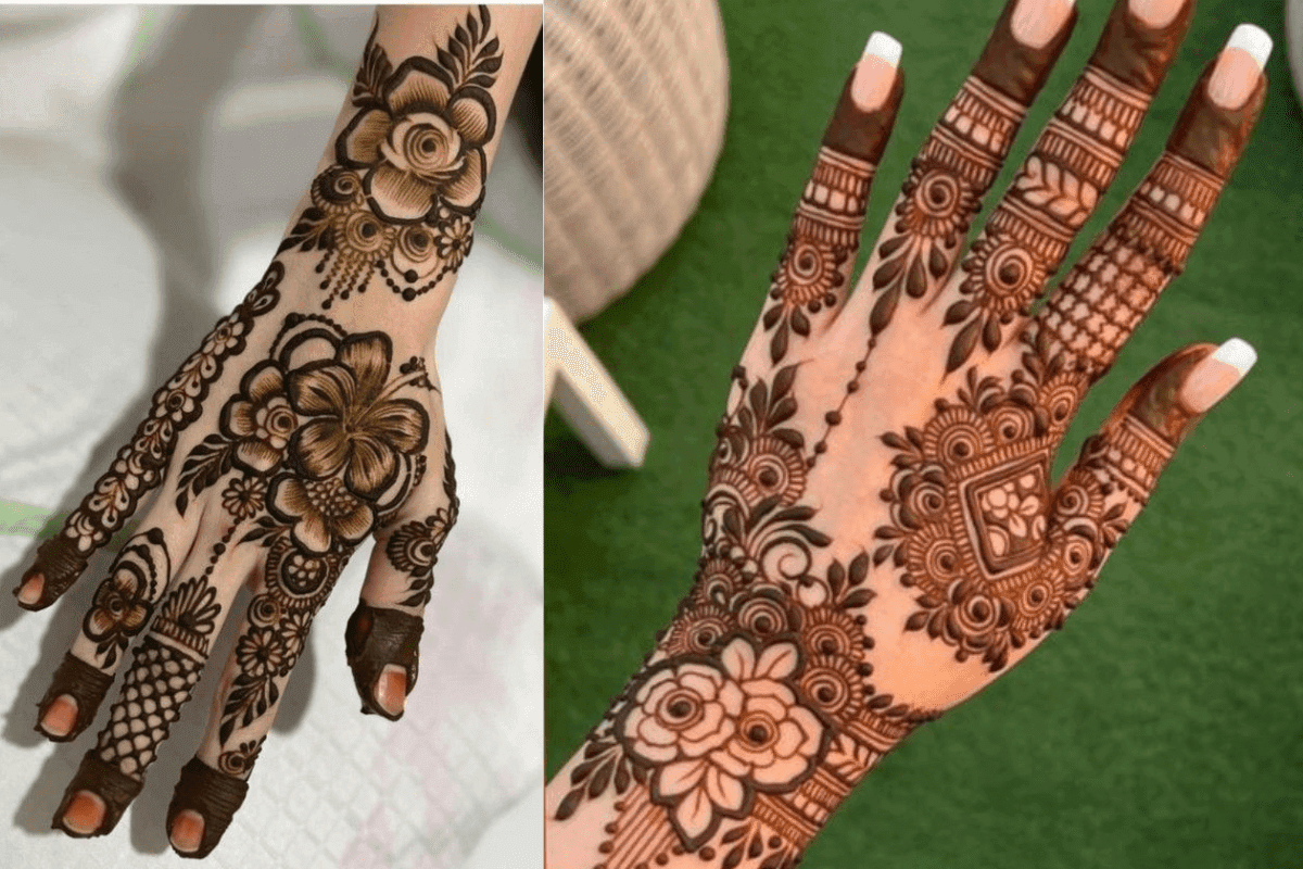 फ्लोरल बैक साइड मेहंदी में फूलों और पत्तियों के पैटर्न का उपयोग किया जाता है. यह डिजाइन हल्की और खूबसूरत दिखती है, इसलिए सिंपल और मॉडर्न लुक के लिए परफेक्ट है. छोटे और बड़े फूलों का कॉम्बिनेशन हाथों को बहुत नेचुरल और आकर्षक बनाता है.