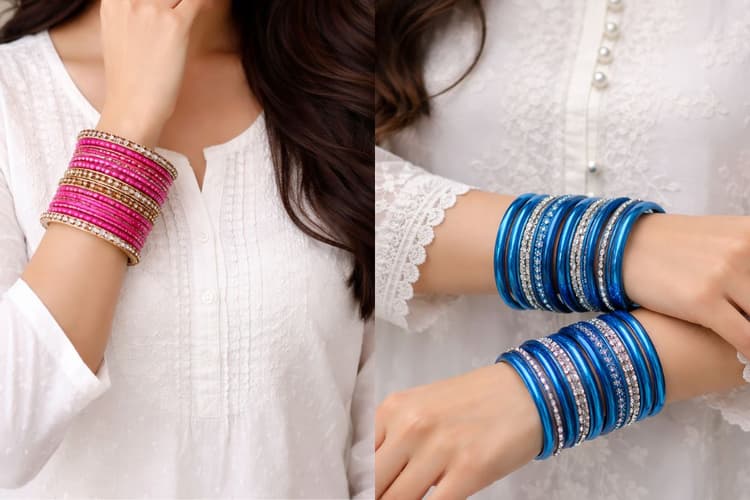 ब्लू रंग की चूड़ियां हाथों में बहुत सुंदर लगती हैं. ये खासकर व्हाइट सूट या कुर्ती के साथ बहुत खूबसूरती से मेल खाती हैं. सफेद आउटफिट पर ब्लू चूड़ियों का रंग उभरकर सामने आता है जिससे पूरा लुक आकर्षक और स्टाइलिश लगता है.