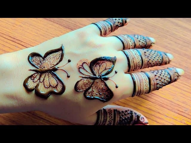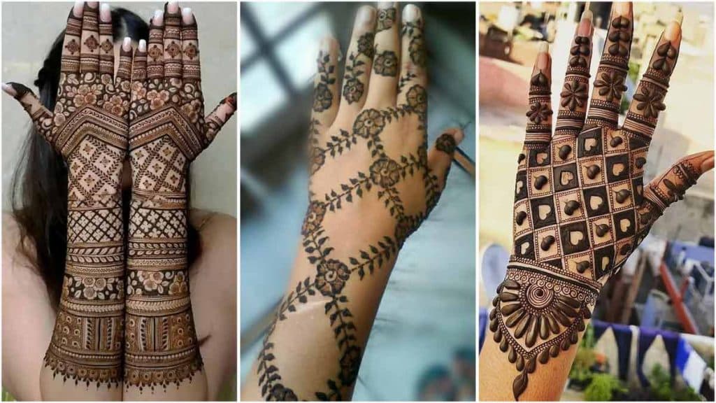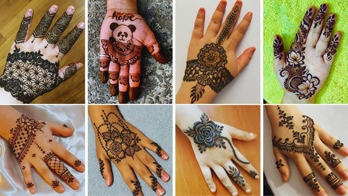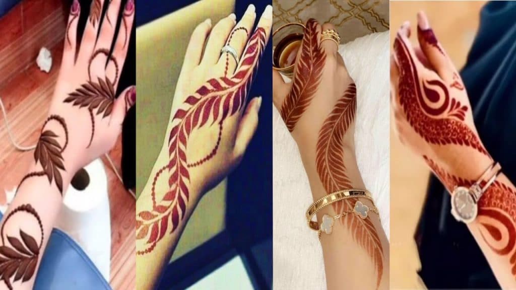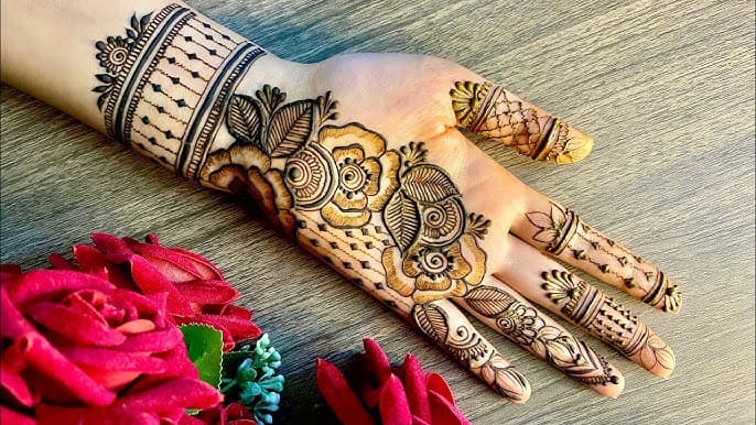 पट्टी डिज़ाइन यानी हाथों की लंबाई में एक स्ट्रिप्स या बैंड्स के पैटर्न का उपयोग करना. यह डिज़ाइन न केवल सुंदर होता है, बल्कि इसे आप अपनी कलाई से लेकर अंगूठे तक बना सकती हैं. यह डिज़ाइन सिम्पल और इंट्रेस्टिंग लगता है, और इस पर छोटे से फूल या बटरफ्लाई जैसे सजावटी आइटम भी जोड़े जा सकते हैं.