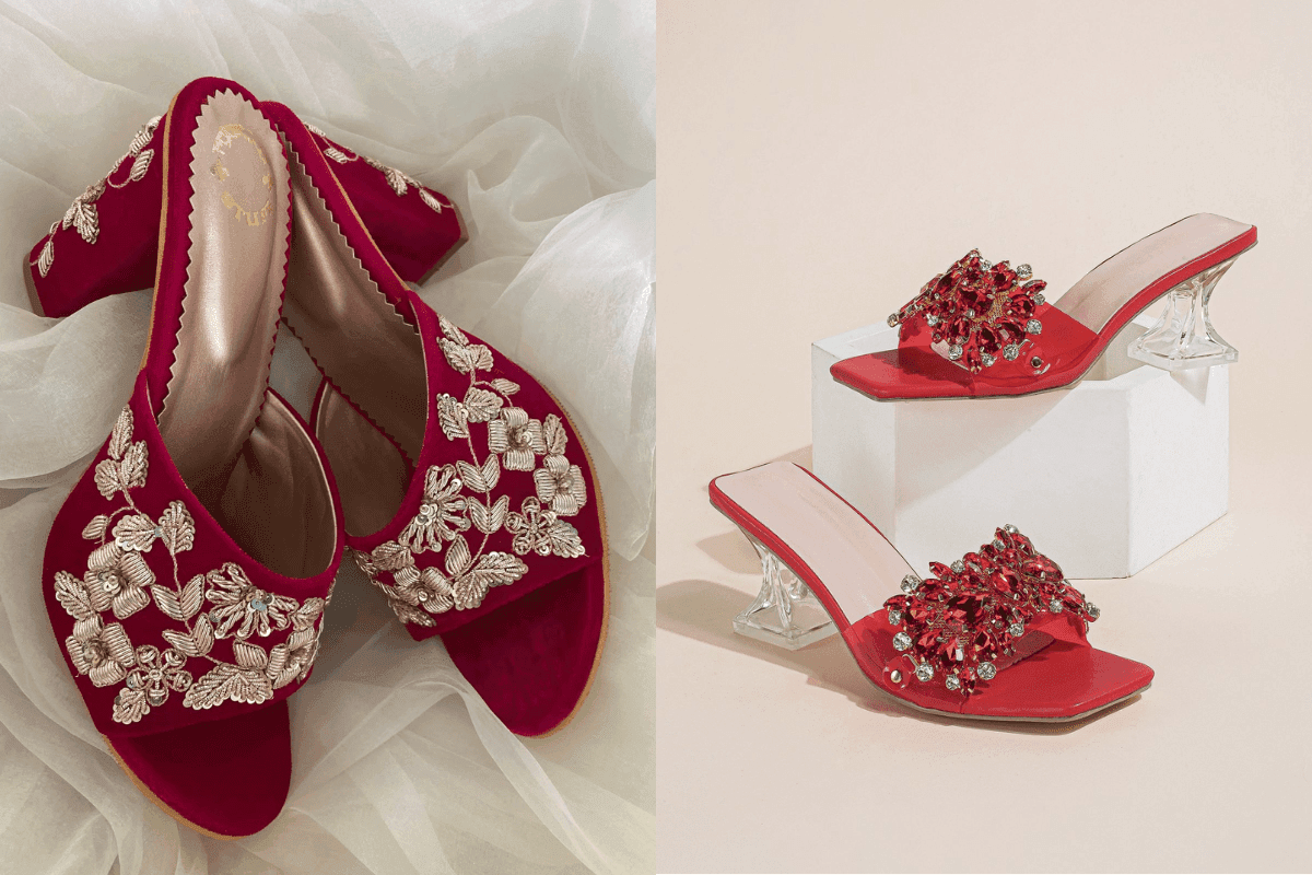 साड़ी का लुक तब और भी खास बनता है जब आपके फुटवियर में भी थोड़ा सा शिमर और सजावट हो. एम्बेलिश्ड हील्स स्टोन, बीड्स या सिक्वेंस से सजी होती हैं, जो शादी और फेस्टिव मौकों पर आपके लुक को रॉयल टच देती हैं.