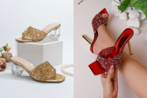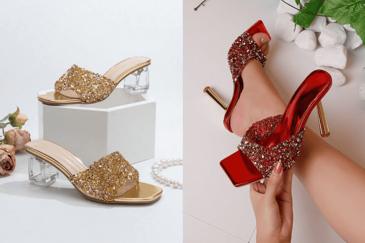 साड़ी का लुक तब और भी खास बनता है जब आपके फुटवियर में भी थोड़ा सा शिमर और सजावट हो. एम्बेलिश्ड हील्स स्टोन, बीड्स या सिक्वेंस से सजी होती हैं, जो शादी और फेस्टिव मौकों पर आपके लुक को रॉयल टच देती हैं.