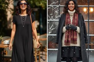 ठंड के मौसम में भी आप फैशनेबल लुक चाहती हैं तो आप ब्लैक ड्रेस को स्टाइल कर के पहन सकती हैं. विंटर लुक के लिए ब्लैक ड्रेस को स्टाइल करने का सबसे अच्छा तरीका है लेयरिंग करना. ड्रेस के ऊपर आप एक स्टाइलिश ओवरकोट या ब्लेजर डालें जिससे आपका लुक एलिगेंट दिखे. आप स्कार्फ का भी इस्तेमाल ड्रेस को स्टाइल करने में कर सकती हैं. फुटवेयर में आप एंकल बूट्स को ट्राई कर सकती हैं.